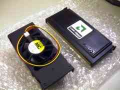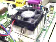 これが新しいSocketAのCPU。上と比べるとずいぶん大きさも形も違います。CPUファンがとれなくなってしまったので、CPU自体は見えませんが・・・ |