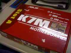 マザーボード ASUS K7M (AMD-751・SLOT-A/ThunderBird対応) 中古で¥5,980 思えば、このマザーとの出会いが今回のメインマシンのスペックを決めるきっかけになりました。 主流のチップセット(VIA-KX133)ではないけど、CPUベンダーのAMDぼチップセットでThunderBirdも動作保証。 |