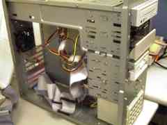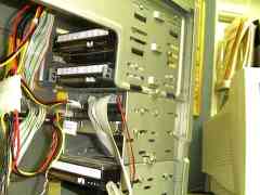 実際にケースに取り付けたところ。一番上がシステムインストール用の9.1GB(ATA66)のハードディスク。あとの2つがミラーリング用の30GBのハードディスク。だんだんケーブルがゴチャゴチャになってくる・・・。 |